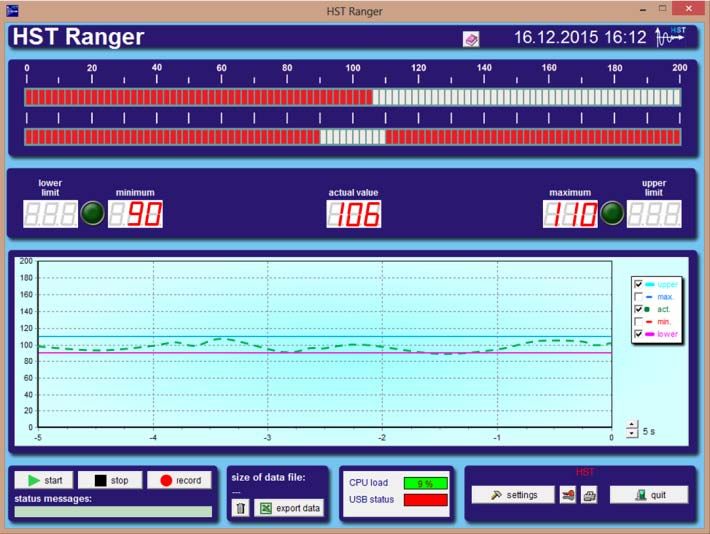 Die optionale HST Ranger-Software ermöglicht die Visualisierung der beiden Balkendiagramme am Computerbildschirm. Zusätzlich wird hier ein Histogramm dargestellt, in dem die Historie des Sensormesswertes und somit der Verlauf des gemessenen Flächengewichtes bis zu 60 Minuten angezeigt wird. Außerdem bietet die Software eine Aufzeichnungsfunktion, mit der die Sensormesswerte im CSV-Format abgespeichert werden können.